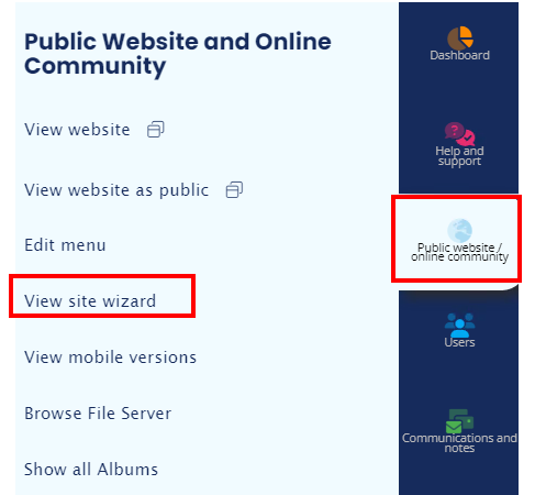 - Go to the Admin Tools menu on the left-hand side of your page > Public website/online community > View Site Wizard.